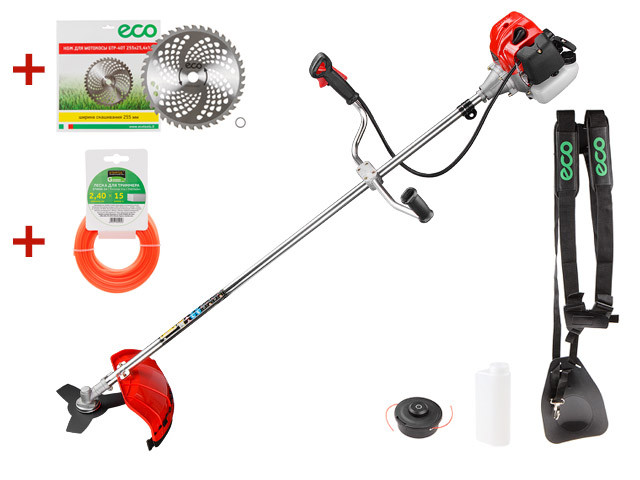 Мощная модель для продвинутых пользователей, которые по достоинству оценят внушительный потенциал мотокосы. --- Преимущества: - Многофункциональная и эргономичная рукоятка велосипедного типа - Цельная удлинительная штанга из легкого алюминия - Эффективная антивибрационная система - Использование улучшенного (усиленного) ручного стартера с системой лёгкий запуск - Цельнометаллический приводной вал - Редуктор повышенной прочности - Топливный бак с полупрозрачными стенками - Праймер (система лёгкого запуска) - Ударопрочный корпус двигателя - Комбинированный защитный кожуху из прочного пластика - Усиленная полуавтоматическая косильная катушка с леской - Прочный трехлопастной нож - Двухплечный ремень для большего комфорта при работе - Два поршневых кольца для высокой компрессии. --- Удобная и эргономичная рукоятка триммера изготовлена в виде велосипедного руля и может устанавливаться в различных положениях, это обеспечивает максимальную управляемость и уменьшает нагрузку на опорно-двигательный аппарат оператора. Блок управления находится на одной ручке, кнопки доступны и располагаются точно под пальцами оператора. Цельносоставная штанга изготовлена из легкого алюминия, что повышает прочность конструкции, снижая её вес. Штанга оснащена антивибрационными демпферами, поглощающими вибрацию и уменьшающими нагрузку на кисти и предплечья. Жесткий приводной вал дает возможность использовать в работе нож или диск. Конический редуктор имеет избыточный запас прочности и способен выдерживать большие нагрузки. При этом редуктор легко отсоединяется, что позволяет использовать двигатель мотокосы в качестве силового агрегата. Топливный бак имеет полупрозрачные стенки для удобства контроля за уровнем топлива. Мотокоса снабжена праймером для предварительной подкачки топлива, который облегчит запуск мотора. Корпус двигателя выполнен из специального ударопрочного пластика и защищает от внешних механических воздействий. Широкий защитный кожух защищает оператора от выброса травы, камней и других вылетающих из-под режущего инструмента предметов. Надёжная полуавтоматическая катушка обеспечивает лёгкую подачу корда. Прочный трёхлопасной нож с лёгкостью справится с дикорастущей травой и кустарником. Два поршневых кольца создают стабильную компрессию, увеличивают срок службы цилиндро-поршневой группы. --- Технические характеристики: Тип двигателя: Двухтактный, воздушное охлаждение; Объём двигателя: 43.0 см3; Максимальная мощность двигателя: 1,45 кВт; Максимальная частота вращения двигателя: 9000-10000 об/мин; Частота холостых оборотов: 3000+10% об/мин; Объём топливного бака: 950 см3; Топливная смесь: Смесь масла с бензином 1 к 40; Диаметр рабочей зоны ножа: 255 мм; Диаметр рабочей зоны лески: 430 мм; Посадочная резьба под головку: М10х1.25; Посадочный диаметр под нож: 25.4 мм; Размер ножа: 255x25.4x1,4 мм; Масса: 7.6 кг; Гарантийный срок: 12 месяцев; --- Комплект поставки: - Двигатель двухтактный бензиновый - 1 шт. - Вал мотокосы в сборе - 1 шт. - Триммерная катушка - 1 шт. - Нож трёхлопастной - 1 шт. - Кожух защитный с винтами крепления - 1 шт. - Ремень плечевой - 1 шт. (двухплечный) - Комплект регулировочных инструментов и принадлежностей - 1 компл. - Дозатор топливной смеси - 1 шт. - Ручка левая - 1 шт. - Ручка правая - 1 шт. - Упаковка - 1 шт. - Упаковка вала - 1 шт. - Руководство пользователя - 1