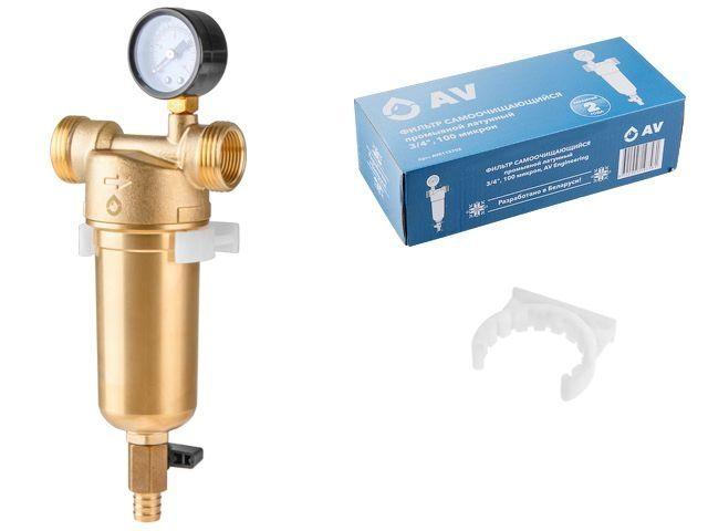 Фильтр самоочищающийся 1" нар. или 3/4"вн., 100 микрон, с манометром, AV Engineering (инд. упак.) (промывной